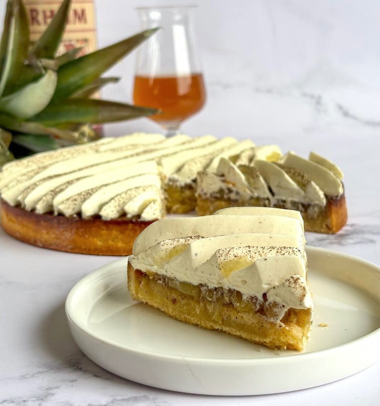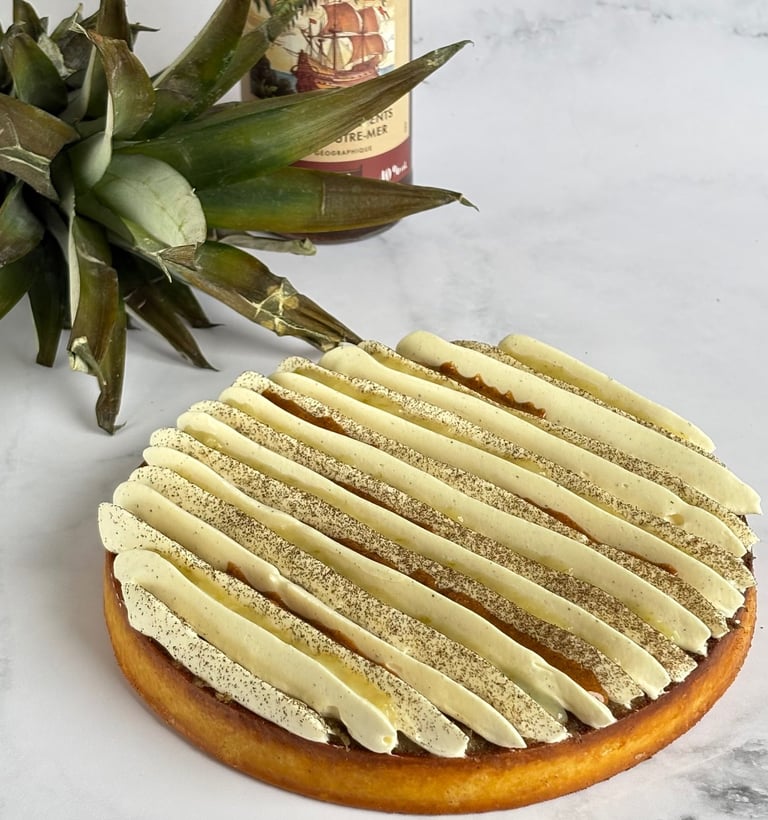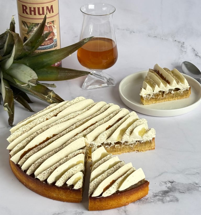 Une tarte alliant exotisme et gourmandise, composée d’une pâte sucrée à la vanille au sablé fondant, garnie d’une crème d’amandes parfumée au rhum.