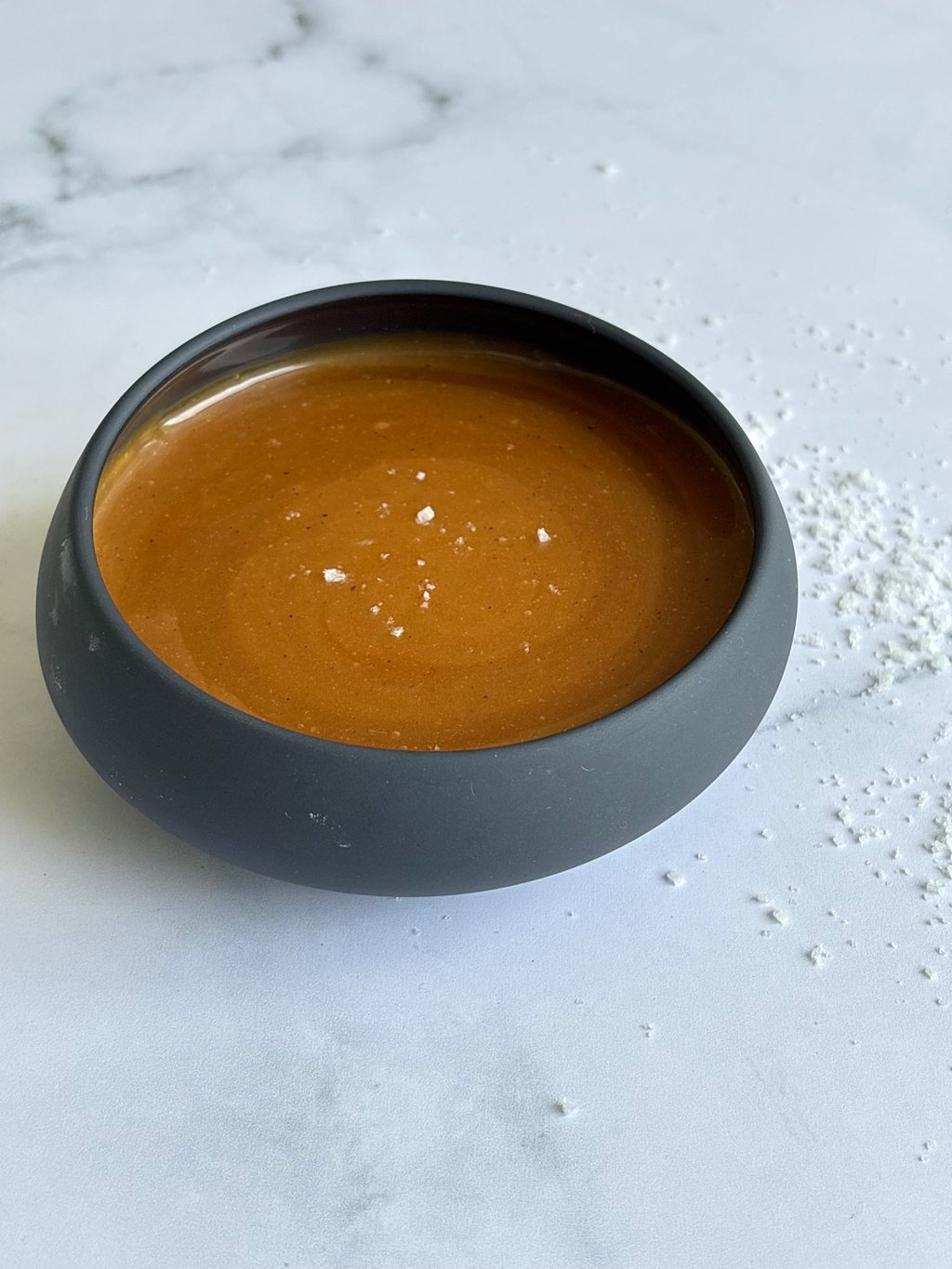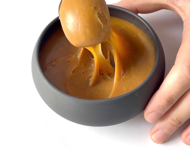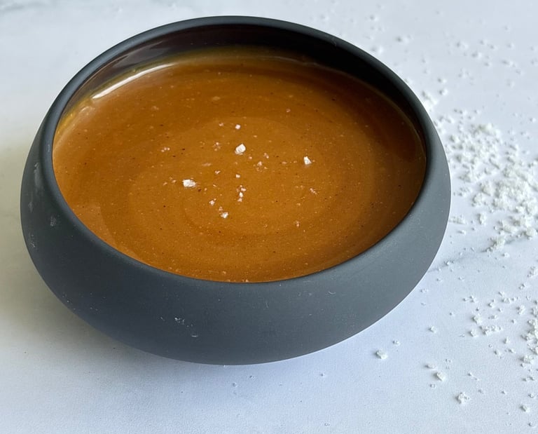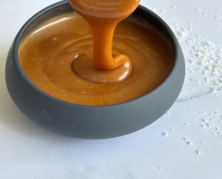 Ce caramel au beurre salé se distingue par sa texture parfaitement équilibrée, à mi-chemin entre la sauce et la pâte à tartiner. Dès sa préparation, il est souple, brillant et nappant, avec un parfum profond de sucre cuit et une pointe de fleur de sel.