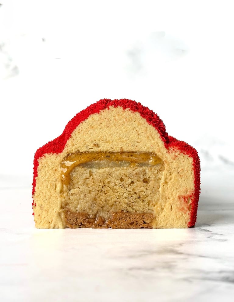 La bavaroise noisette, légère et aérienne, enveloppe chaque élément avec douceur. Gourmande sans être lourde, elle sublime la profondeur du fruit sec.