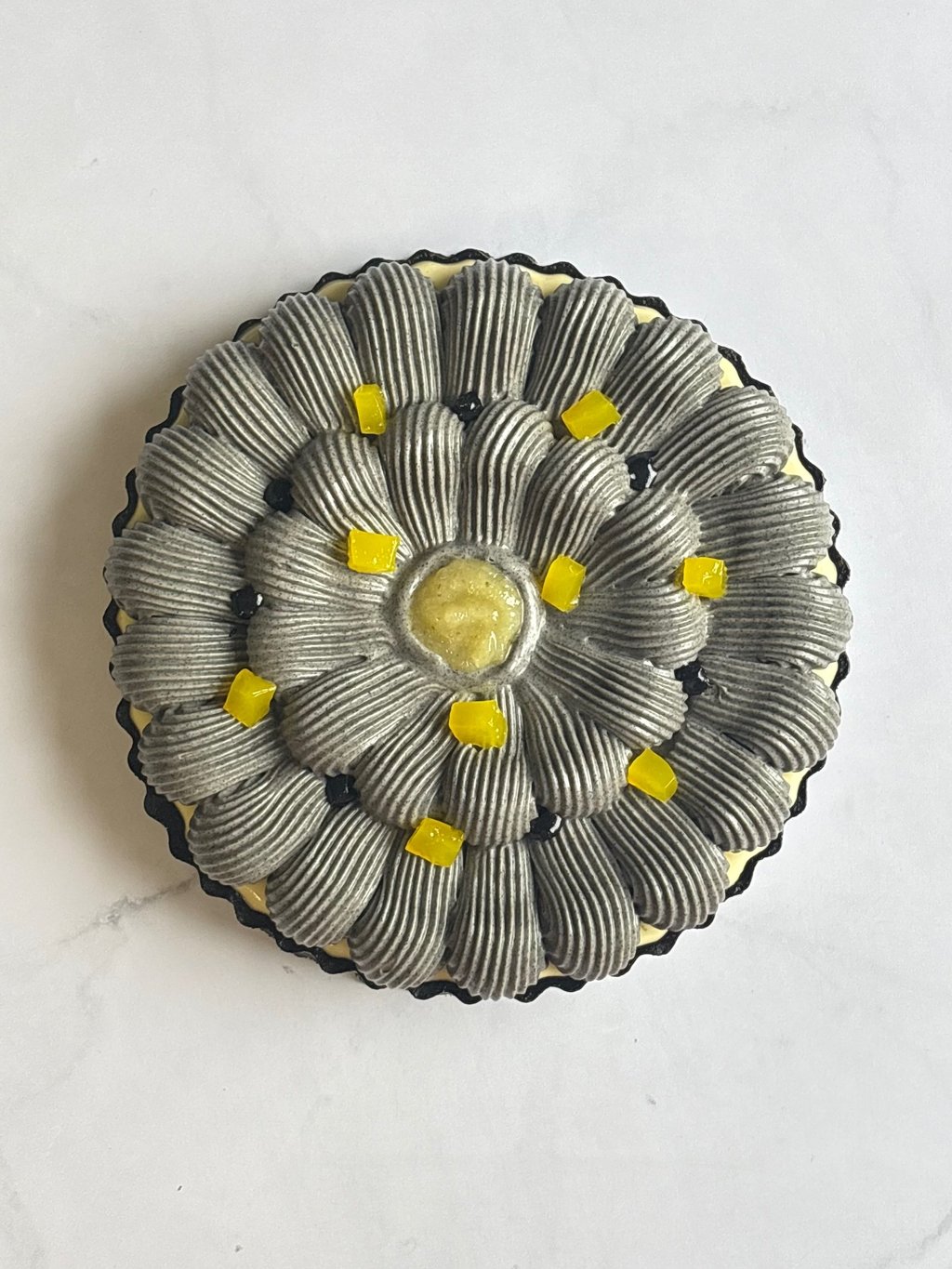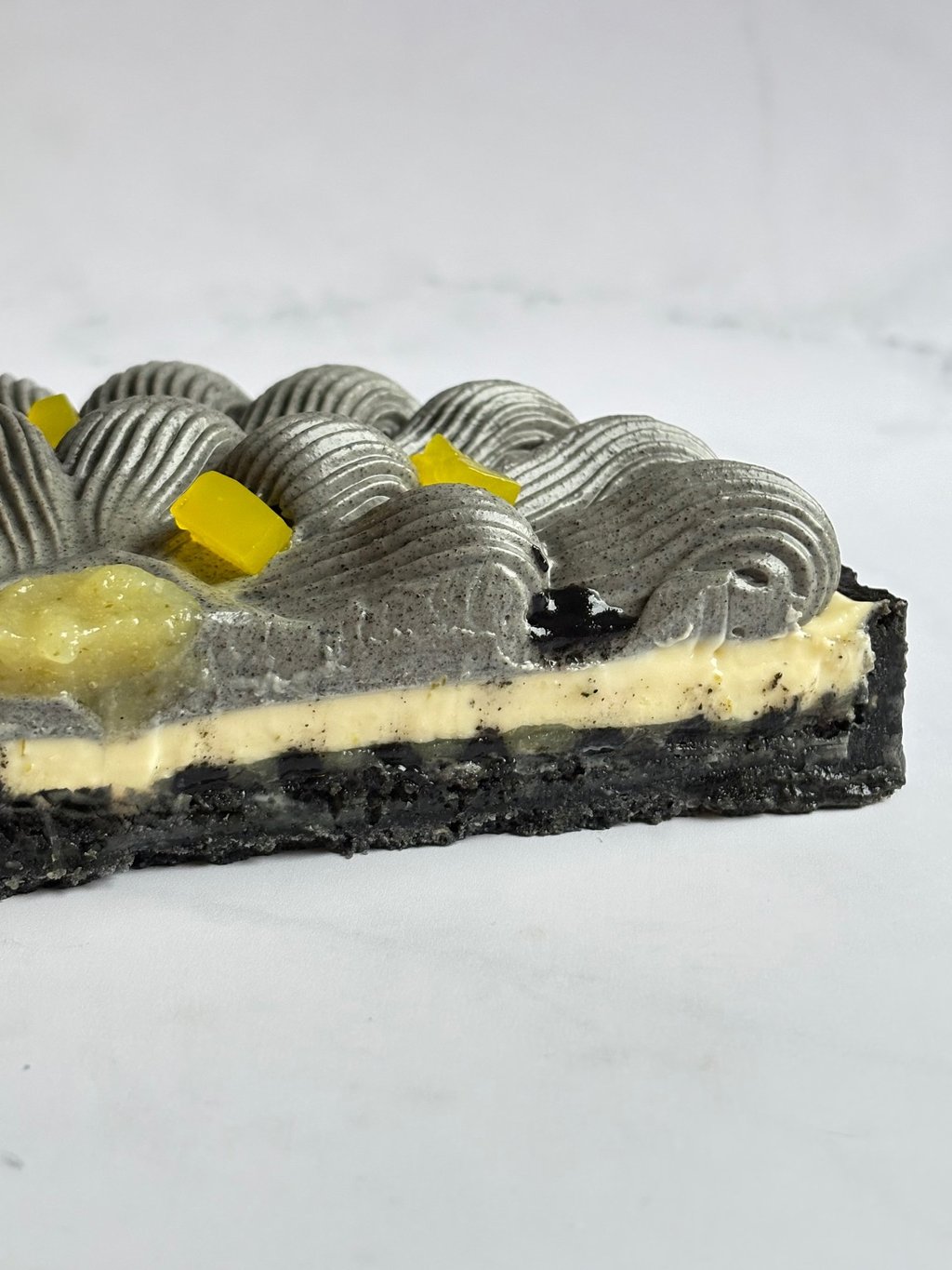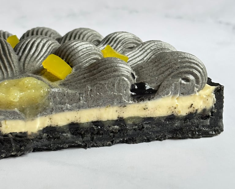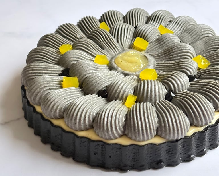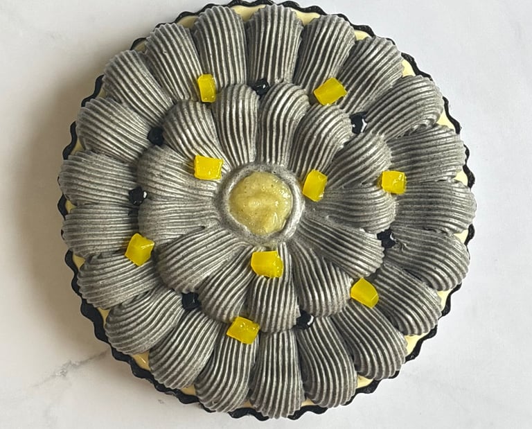 Une tarte tout en contrastes, jouant sur le noir profond du sésame et l’éclat acidulé du citron, pour une dégustation moderne, audacieuse et mémorable.