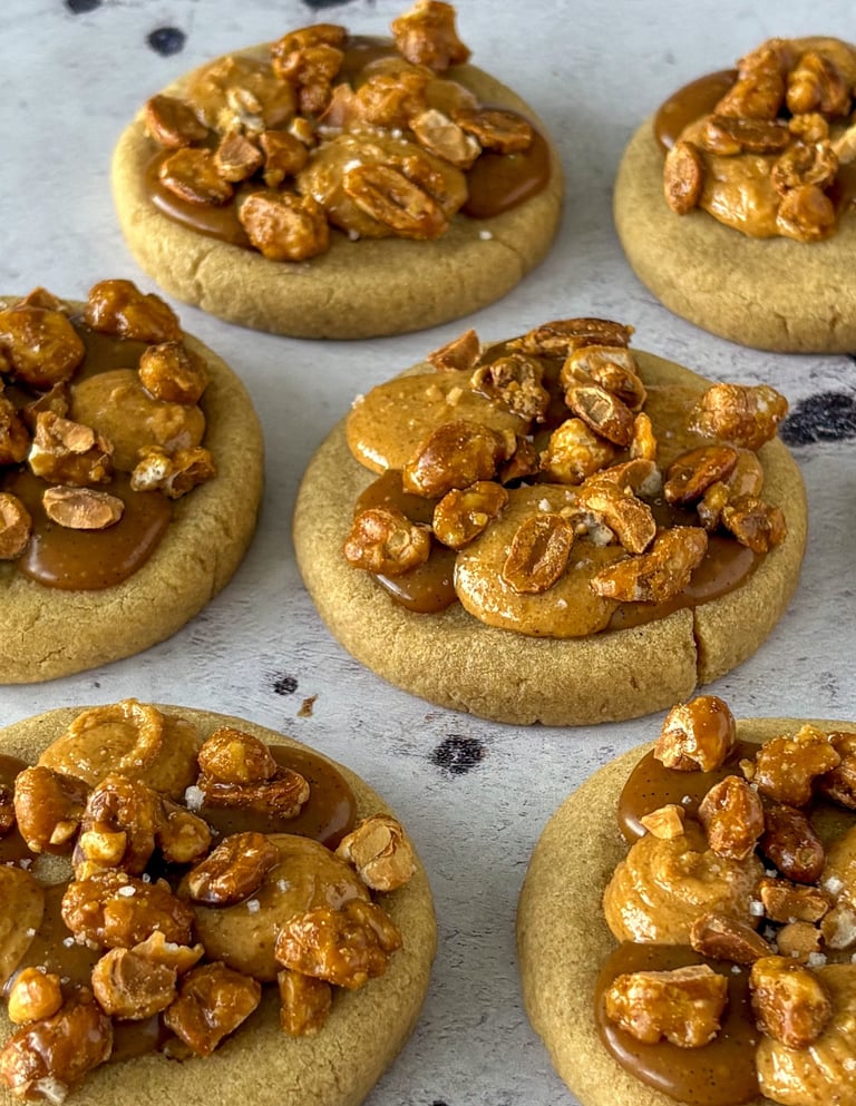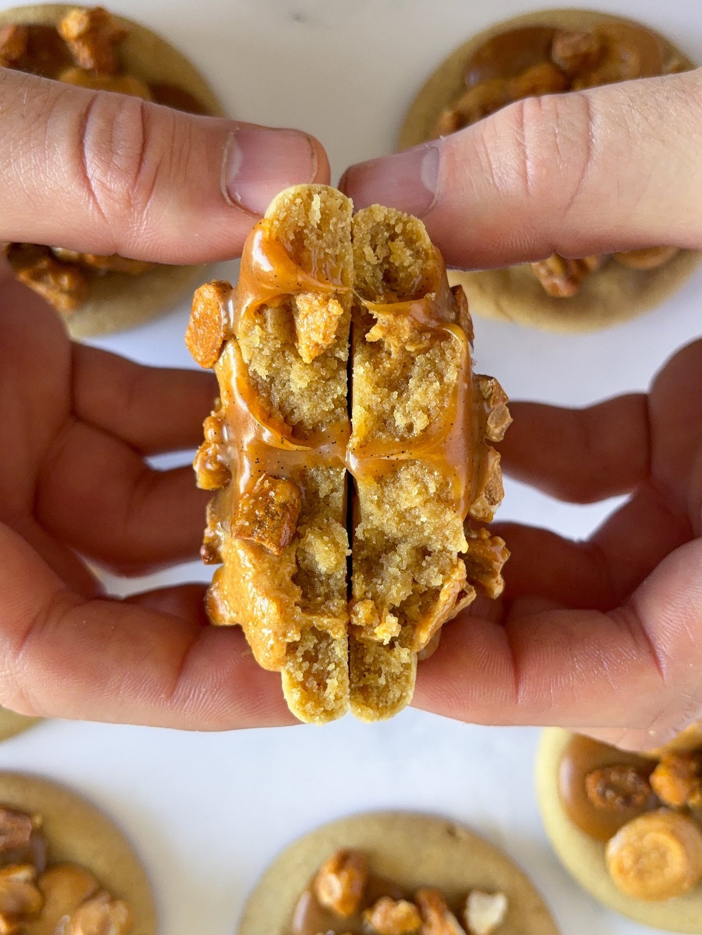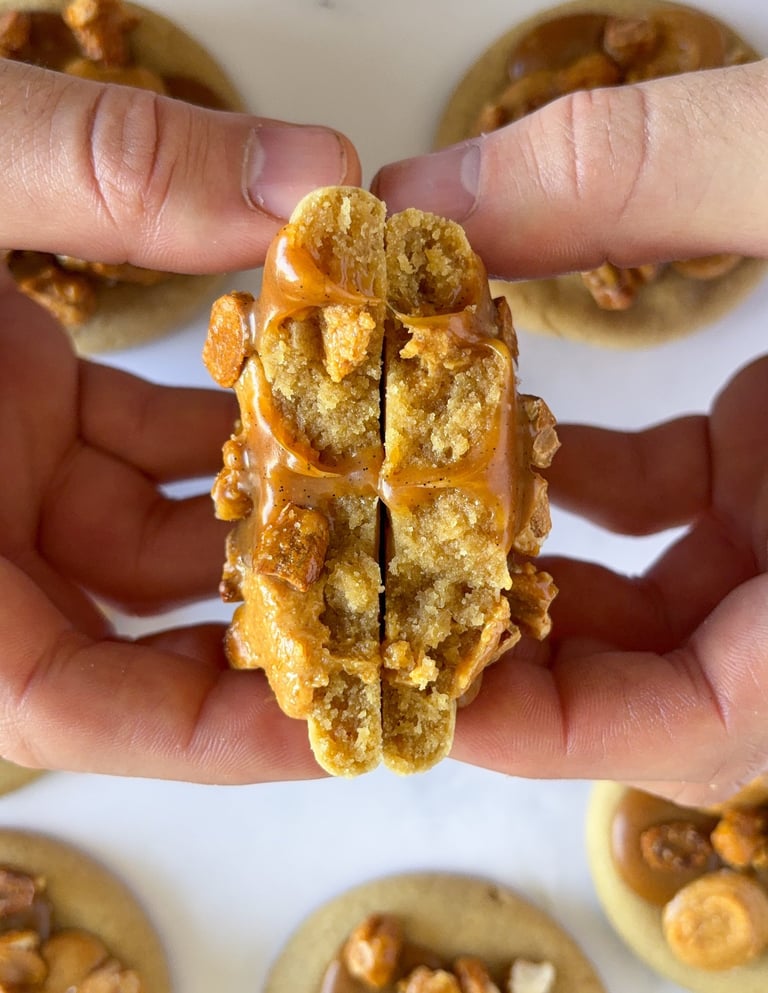 Enfournez pendant 8 minutes puis pocher quelques points de praliné et de caramel en enfonçant la poche dans le cookie encore chaud.