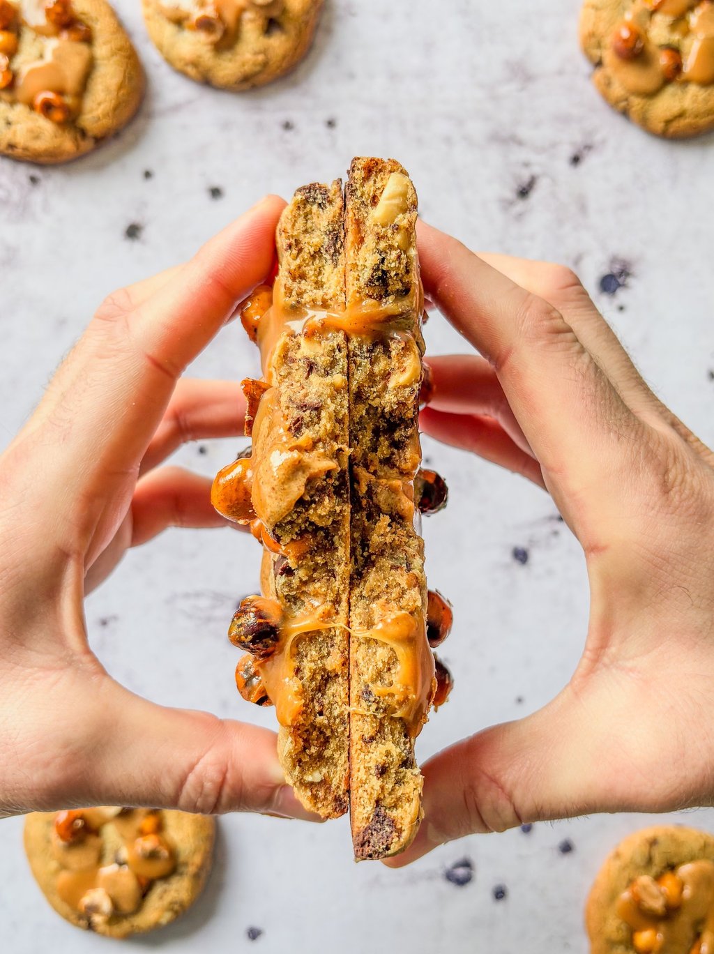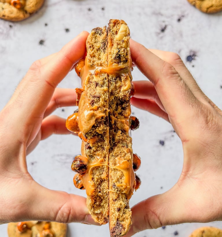 Un cookie géant, moelleux à cœur et croustillant sur les bords, renfermant plusieurs cœurs de caramel beurre salé onctueux à la vanille qui se mêle au praliné noisette à la fleur de sel, pour un équilibre parfait. Le tout est parsemé de noisettes caramélisées pour un croquant irrésistible et une touche torréfiée ultra réconfortante. C’est une véritable bombe de gourmandise, fondante, croustillante, addictive — bref, une tuerie absolue. Ce qui est bien, c'est que vous pouvez adaptez cette recette et vous amusez à les réaliser avec des toppings différents selon vos envies !