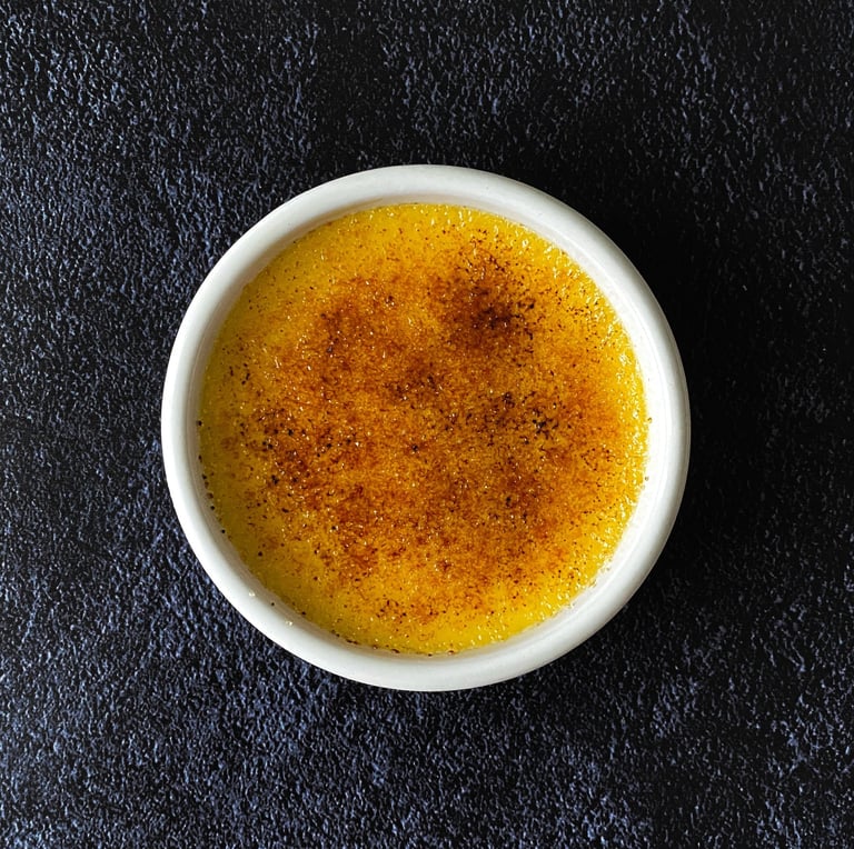 La surface est caramélisée à la flamme juste avant la dégustation : une fine couche de sucre fondu, ambrée et craquante, qui se brise délicatement à la cuillère pour révéler la crème tiède et fondante en dessous. Ce contraste entre croquant chaud et crème froide fait toute la magie du dessert.