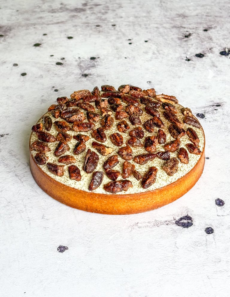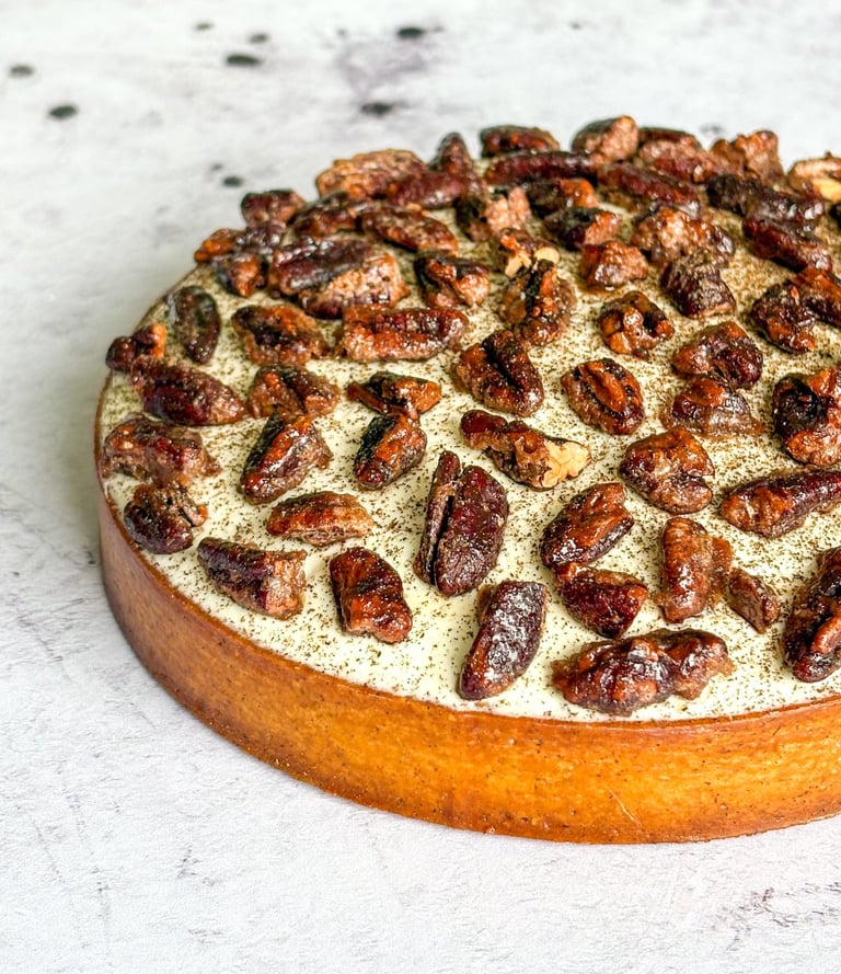 Pour apporter encore plus de gourmandise et de croquant, des noix de pécan caramélisées sont déposées sur la ganache montée. Une vrai merveille.