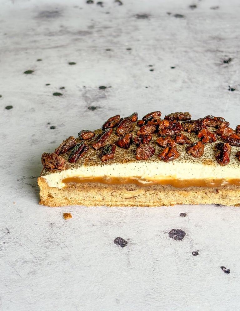 Elle est composée d’une pâte sucrée vanille, d’une crème de noix de pécan aux éclats de noix de pécan torréfiées, d’une pâte de noix de pécan à la fleur de sel, d’un caramel onctueux à la vanille, et le tout enfermé dans une ganache montée légère et aérienne à la vanille.