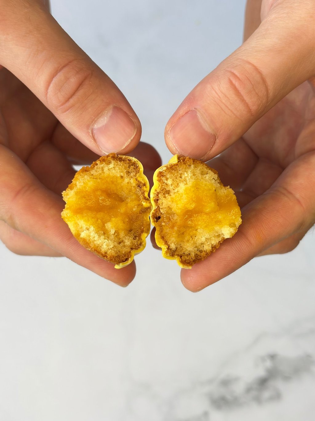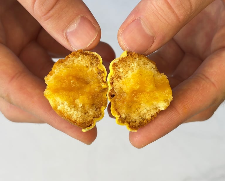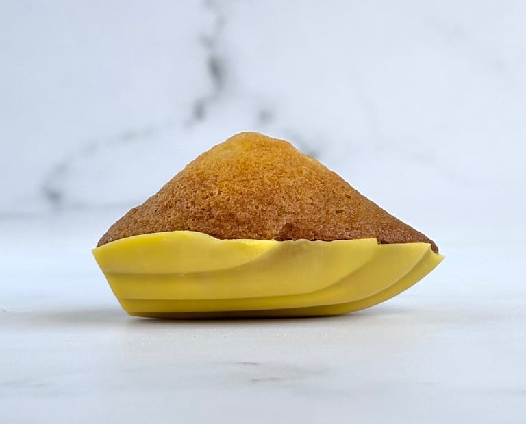 Inspirée du style délicat et généreux de François Perret, cette madeleine revisite le grand classique en un bijou de gourmandise moderne. Sa pâte, fine et délicatement beurrée, offre une texture moelleuse et fondante, avec ce léger rebond caractéristique des madeleines parfaitement maîtrisées.
