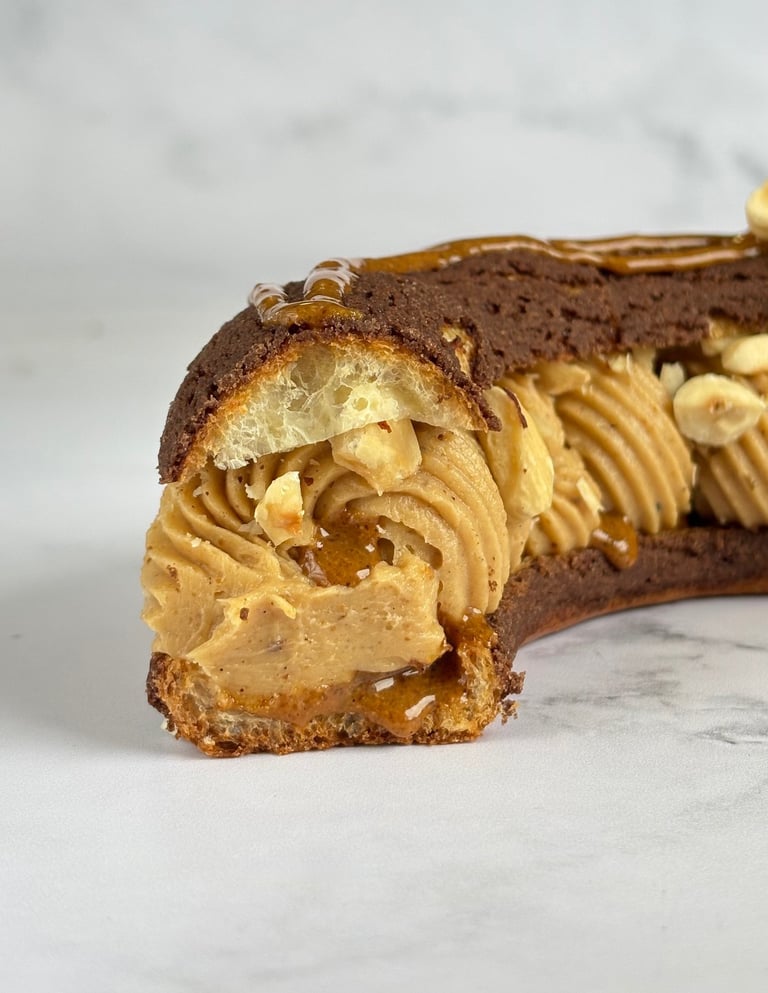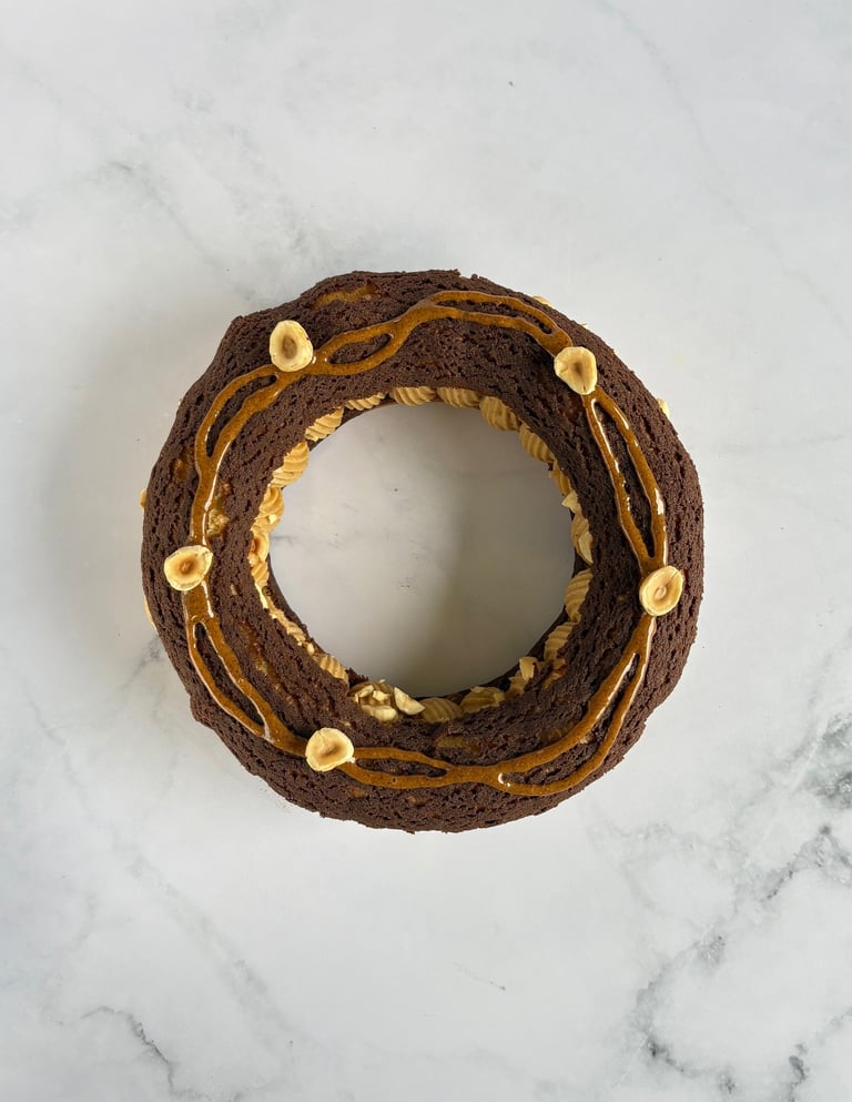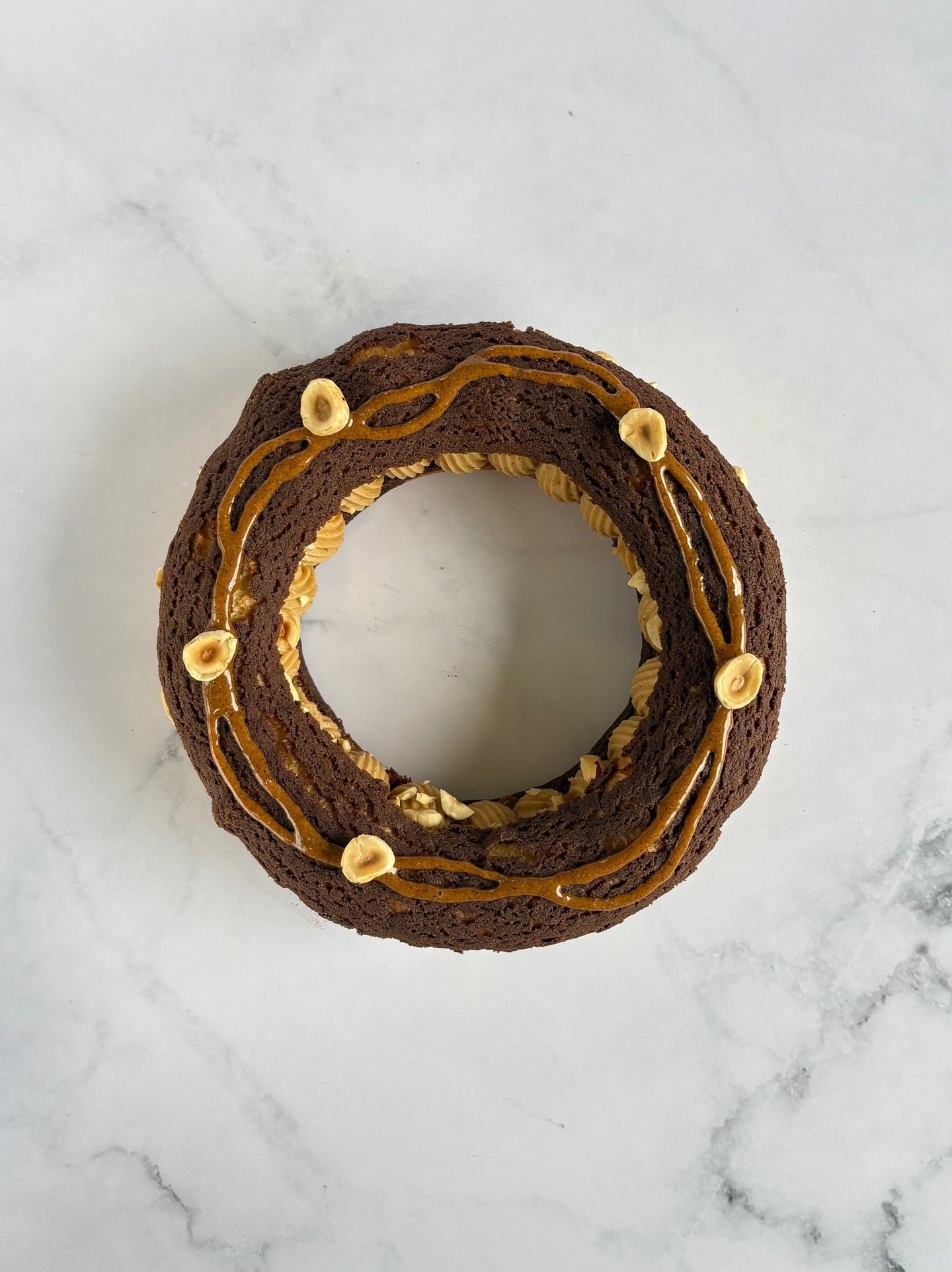 À l’intérieur, une mousseline praliné noisette riche et aérienne vient garnir généreusement l’anneau. Sa texture est d’une onctuosité enveloppante, mêlant douceur, intensité pralinée et une pointe de beurre qui apporte une tenue parfaite sans lourdeur. Les noisettes grillées, intégrées ou disposées en touches gourmandes, ajoutent un croquant chaleureux et une puissance aromatique irrésistible.