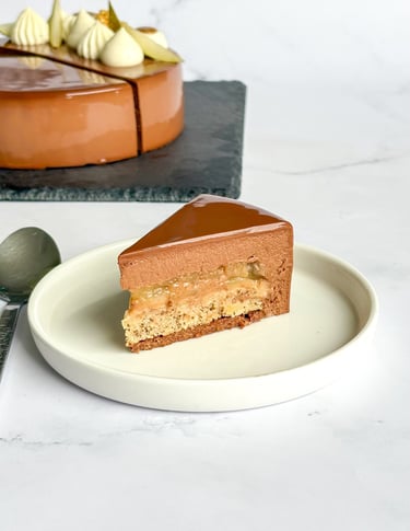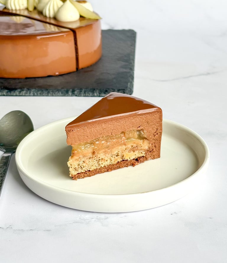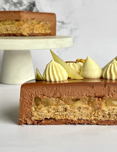 Un entremets harmonieux, mêlant croquant, moelleux, fondant et onctuosité, où la poire et le chocolat se répondent avec équilibre et raffinement.