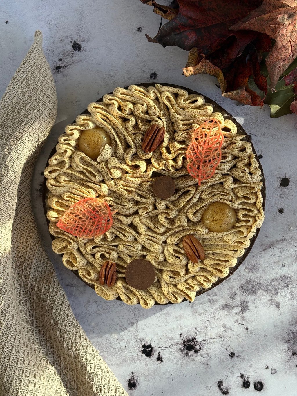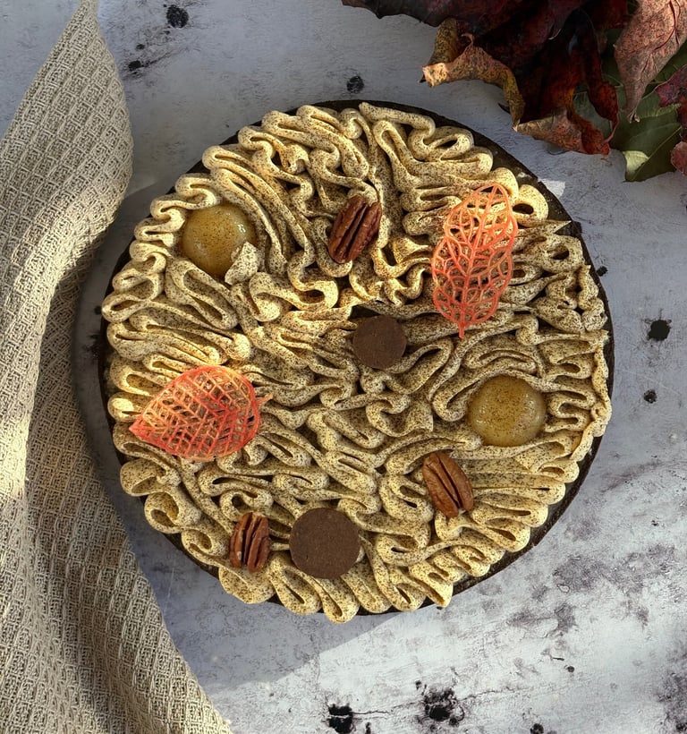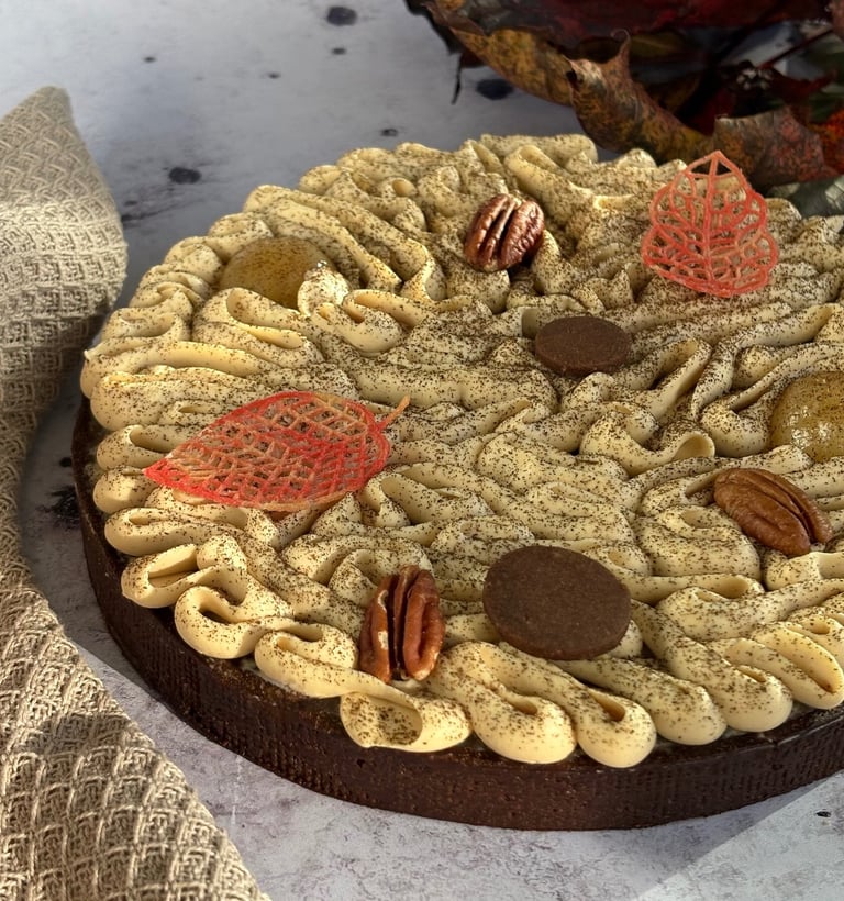 Enfin, la tarte est couronnée d’une ganache montée Dulcey, aérienne, soyeuse et subtilement caramélisée. Sa douceur biscuitée s’accorde parfaitement aux notes chaudes des pécans et à la tendresse des poires.