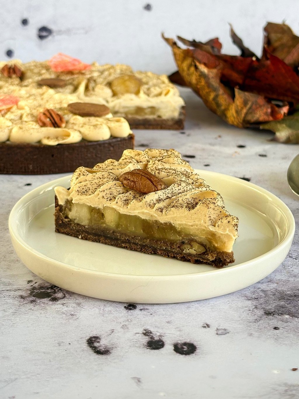 En bouche, chaque bouchée mêle croustillant, fondant, fraîcheur fruitée et douceur caramélisée, dans une harmonie chaleureuse et réconfortante. Une tarte automnale, généreuse et profondément gourmande.