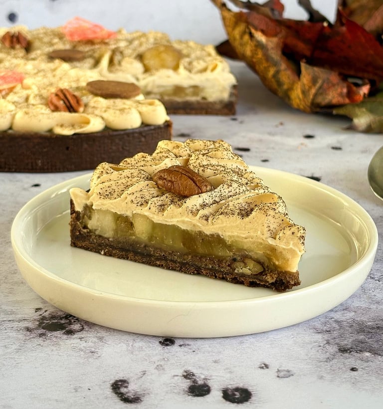 La pâte sucrée pécan, fine et délicatement sablée, apporte une base croustillante relevée par les arômes torréfiés de la noix de pécan. Elle installe d’emblée une chaleur gourmande qui définit la signature de la tarte.