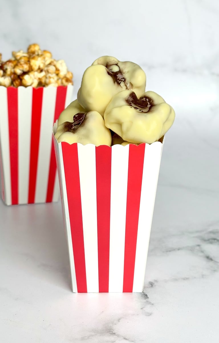 Faire fondre le chocolat blanc et le beurre de cacao au bain marie, puis à l'aide d'un pic à brochette, tremper chaque pop-corn dans l'enrobage en effectuant 3 ou 4 aller/retour. Attendre quelques secondes que l'enrobage fige et déposer sur du film alimentaire.
