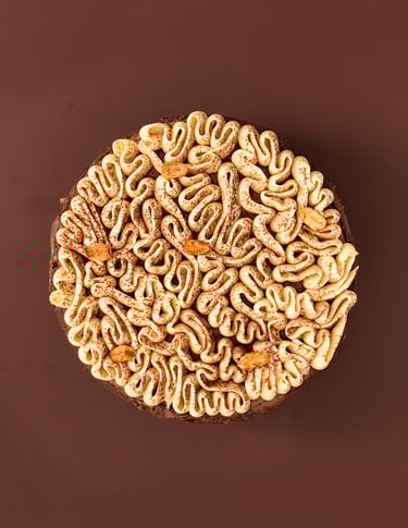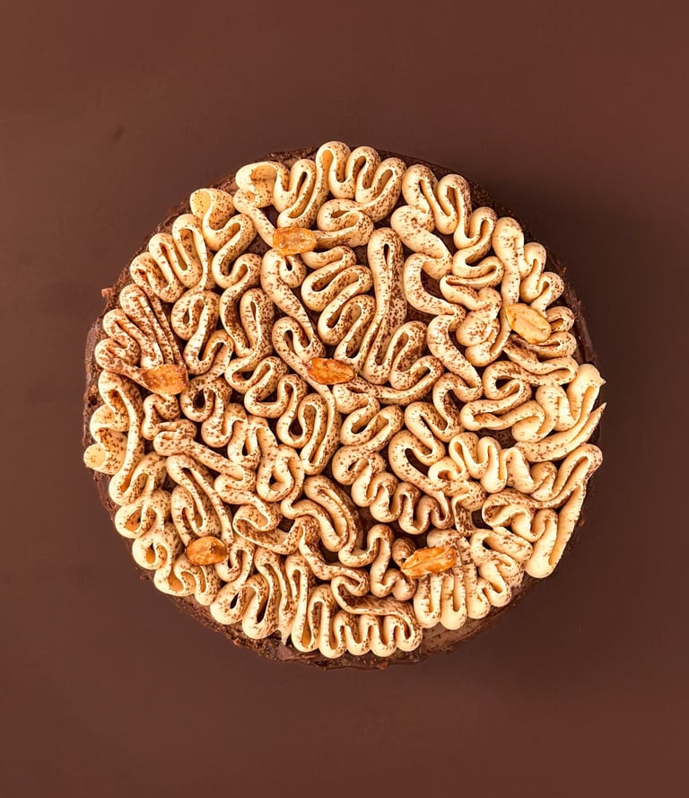 Les côtés sont recouverts d’un glaçage rocher aux cacahuètes, qui offre un contraste craquant et un visuel ultra gourmand. Sur le dessus, une ganache montée praliné cacahuètes est pochée délicatement, en rappel subtil de la base croustillante, pour une finition à la fois élégante et généreuse.