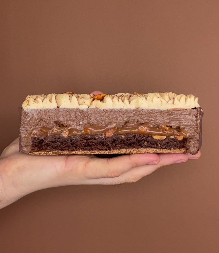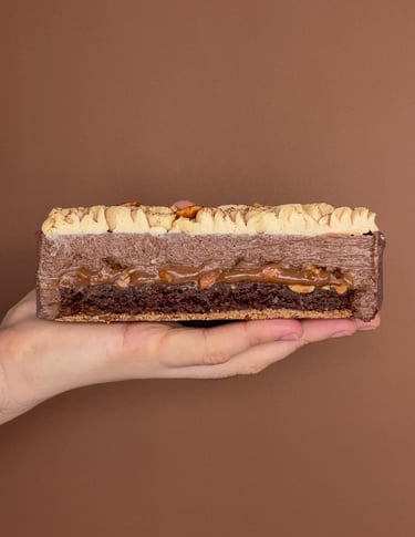 Un entremets inspiré du célèbre Snickers, revisité dans une version raffinée et résolument gourmande. Une création où le croustillant rencontre le fondant, et où chaque couche évoque le plaisir du chocolat, du caramel et de la cacahuète dans un parfait équilibre