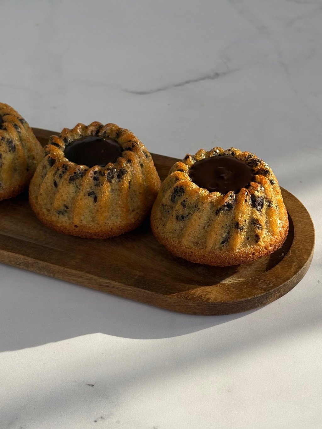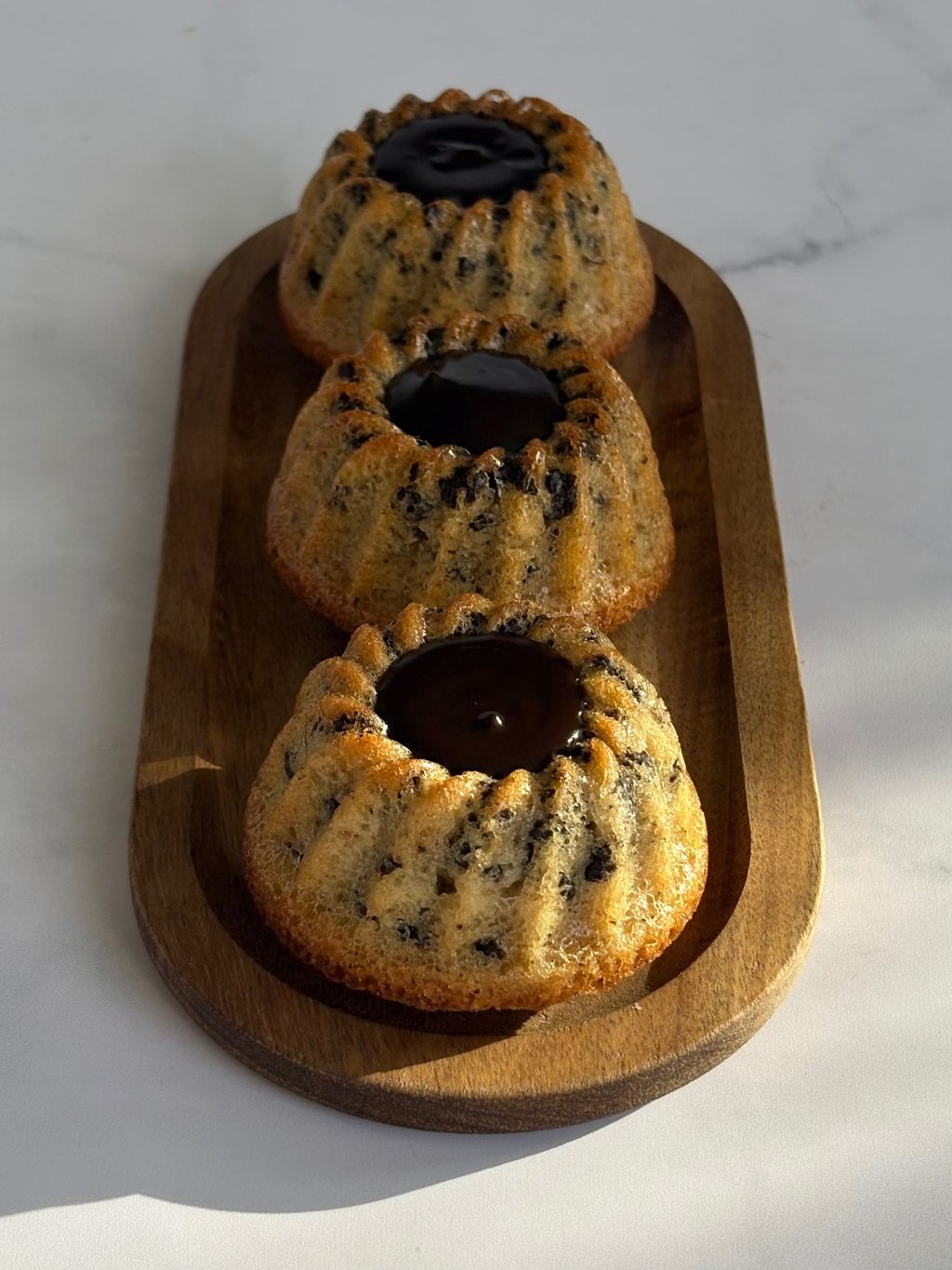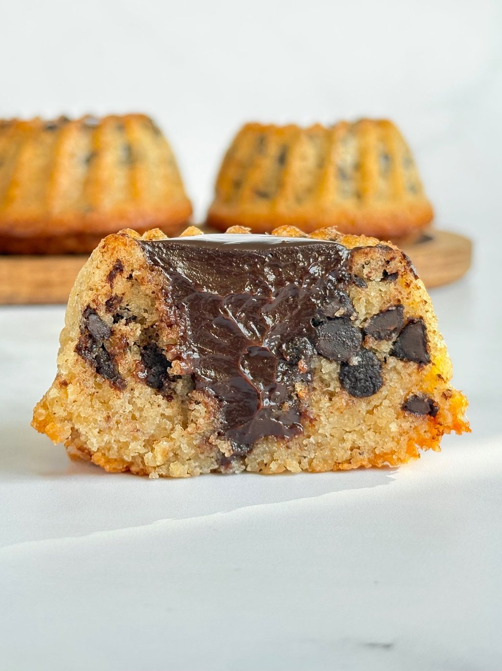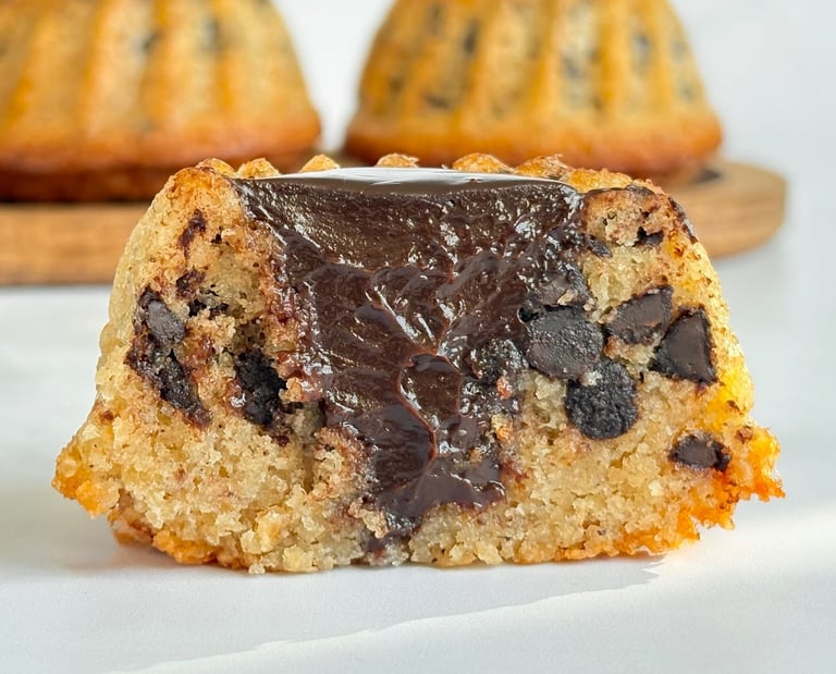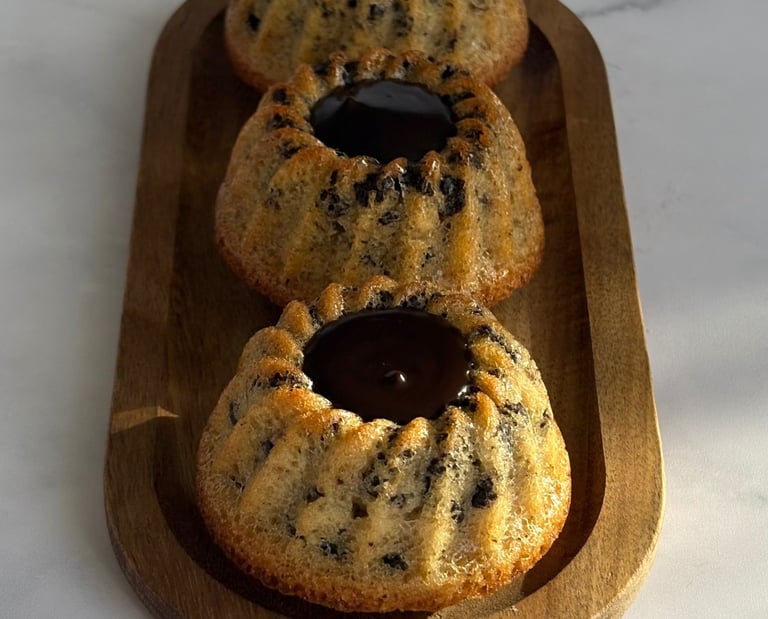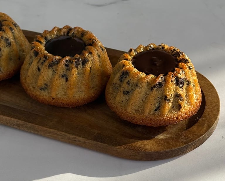 Ces tigrés revisités en mini kougloff mêlent l’élégance d’un moule alsacien et la gourmandise d’un grand classique chocolaté. Leur pâte moelleuse, riche en poudre d’amande, dévoile un fondant ponctué de pépites de chocolat, rappelant le motif tigré qui leur a donné leur nom. La cuisson dans le moule à mini kougloff apporte une silhouette raffinée, légèrement cannelée, qui met en valeur la cavité centrale.