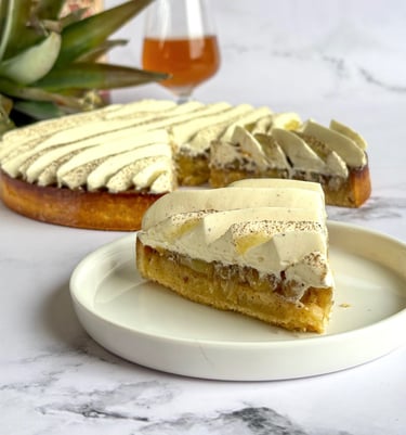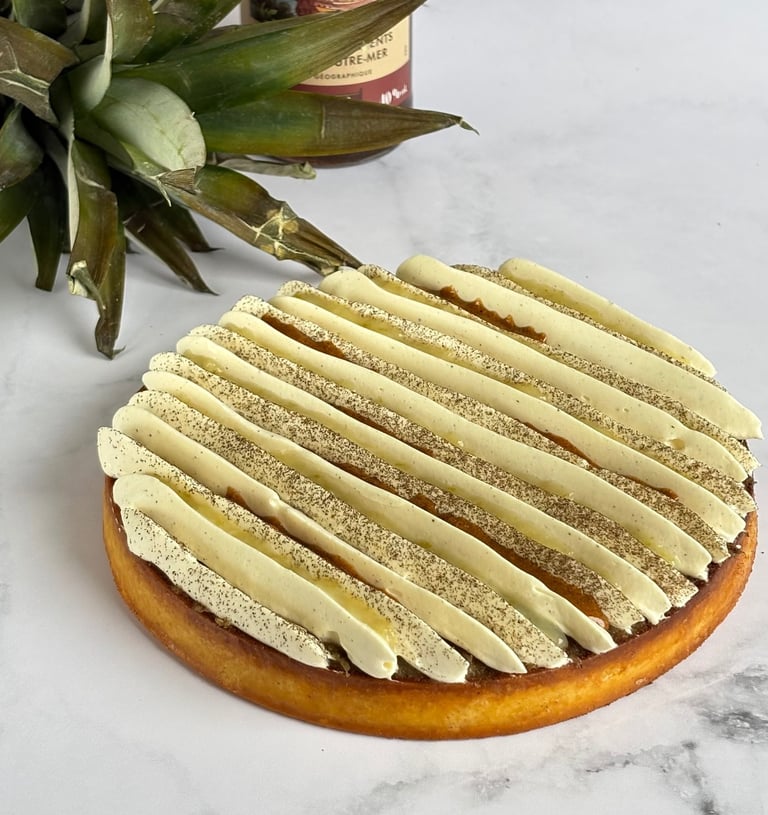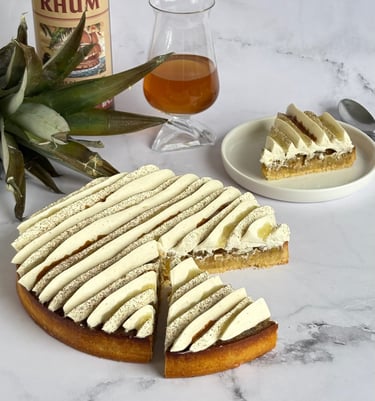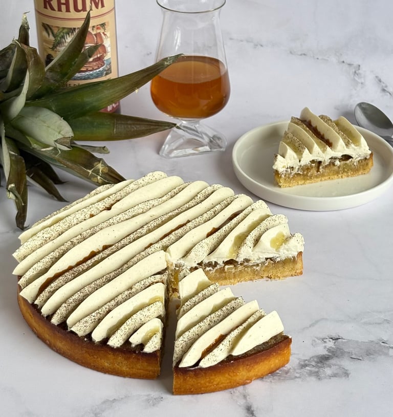 Une tarte alliant exotisme et gourmandise, composée d’une pâte sucrée à la vanille au sablé fondant, garnie d’une crème d’amandes parfumée au rhum.