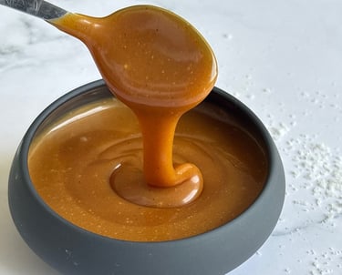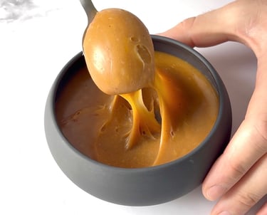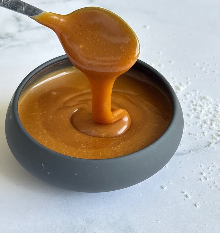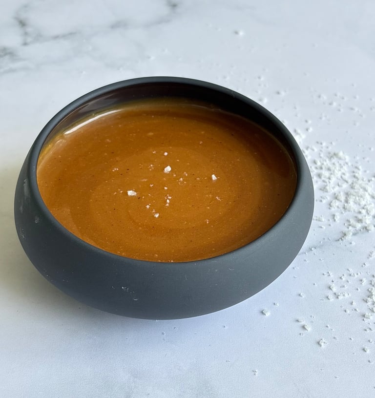 Ce caramel au beurre salé se distingue par sa texture parfaitement équilibrée, à mi-chemin entre la sauce et la pâte à tartiner. Dès sa préparation, il est souple, brillant et nappant, avec un parfum profond de sucre cuit et une pointe de fleur de sel.