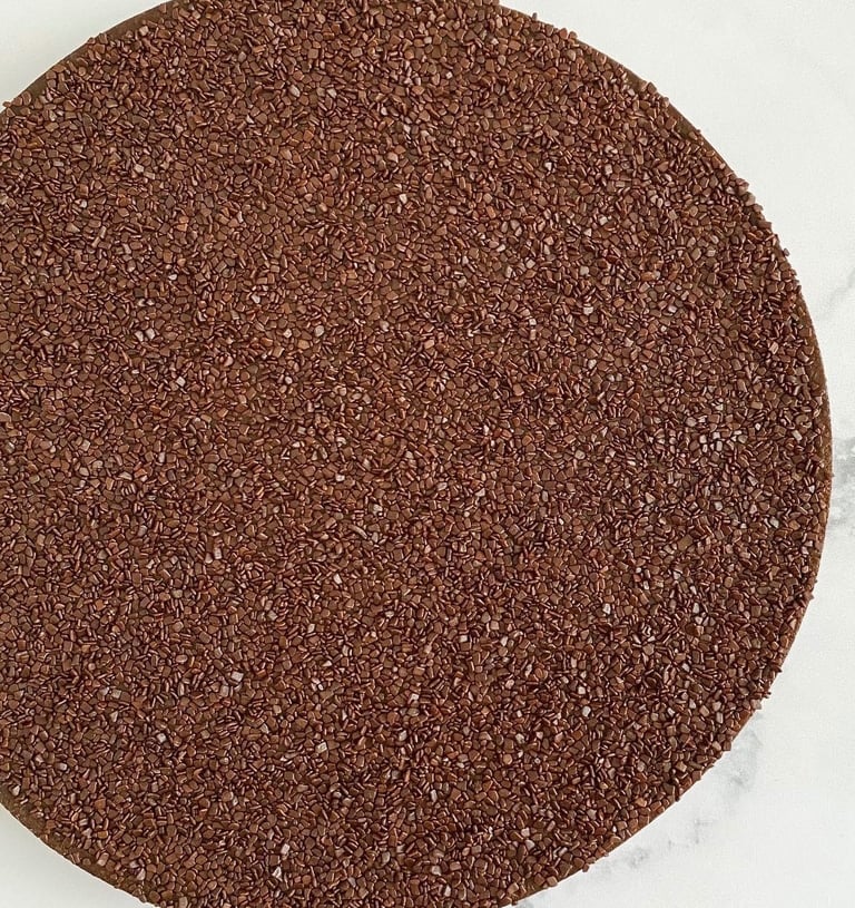 Parsemez uniformément des paillettes en chocolat sur la ganache. Placez votre tarte 2h au réfrigérateur, ou mieux, toute une nuit à température ambiante avant de déguster.