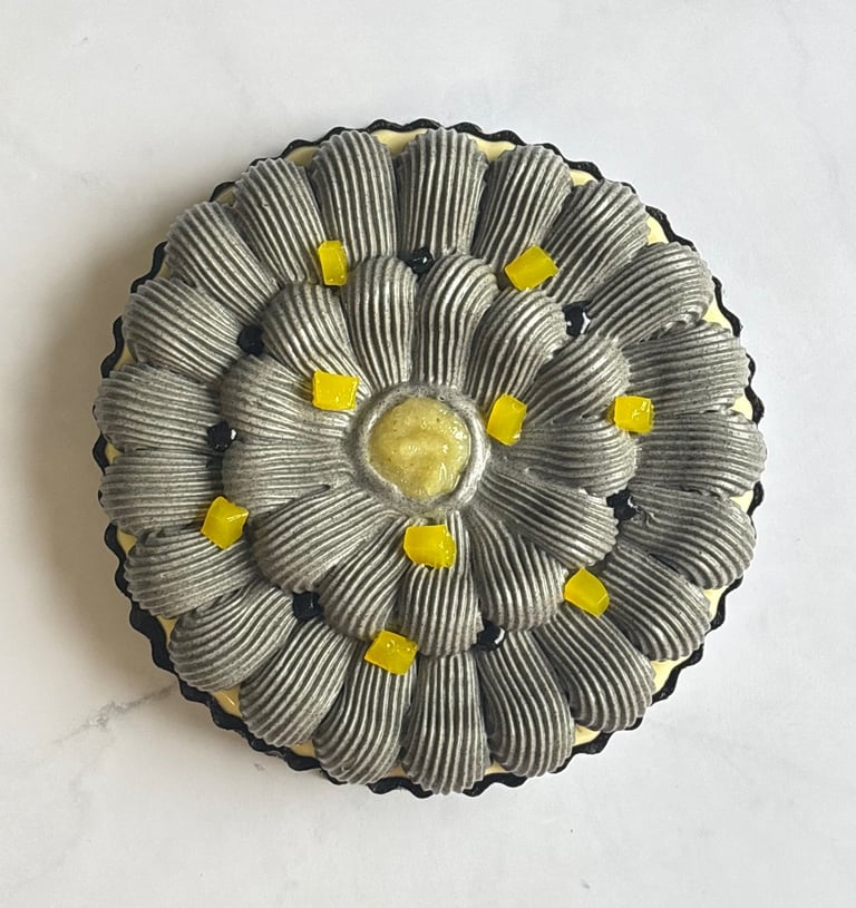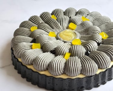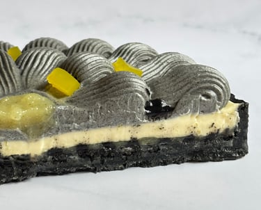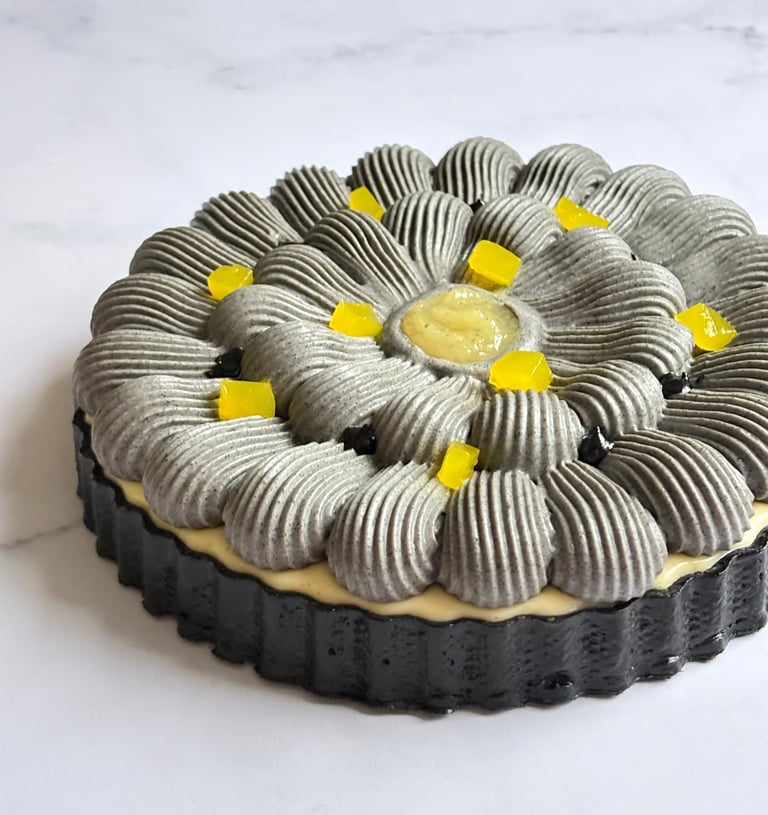 Une tarte tout en contrastes, jouant sur le noir profond du sésame et l’éclat acidulé du citron, pour une dégustation moderne, audacieuse et mémorable.