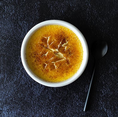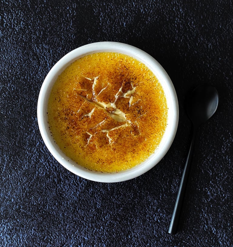 La surface est caramélisée à la flamme juste avant la dégustation : une fine couche de sucre fondu, ambrée et craquante, qui se brise délicatement à la cuillère pour révéler la crème tiède et fondante en dessous. Ce contraste entre croquant chaud et crème froide fait toute la magie du dessert.