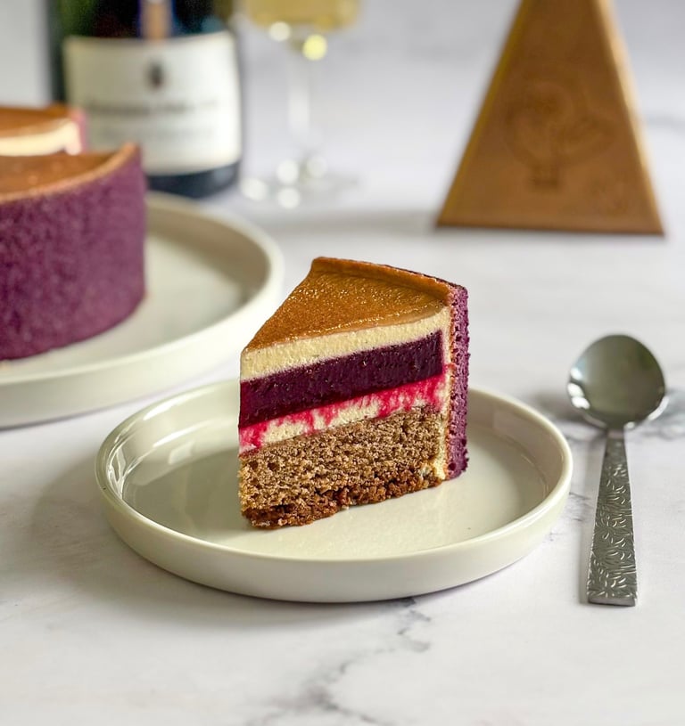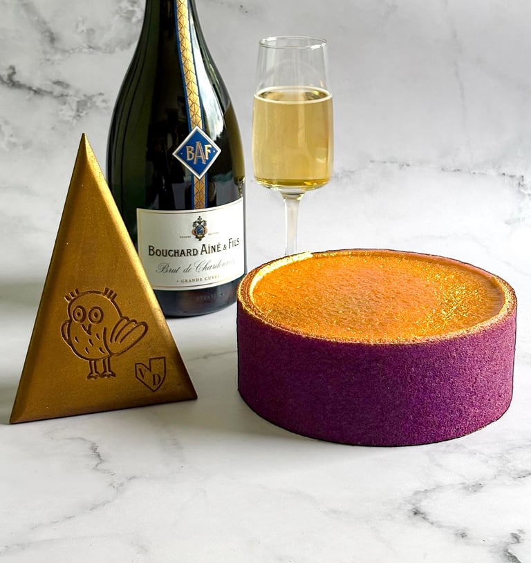Il se compose d’une mousse vanille onctueuse, douce et enveloppante, qui sublime une compotée cassis-crémant aux notes fruitées et acidulées. À la base, une alliance de textures : un biscuit madeleine moelleux aux pain d'épices et un croustillant praliné au pain d’épices apportant chaleur et gourmandise. Le tout est couronné d’un délicat gel au crémant de Bourgogne, couvert d'or et élégant, qui évoque la finesse des bulles.