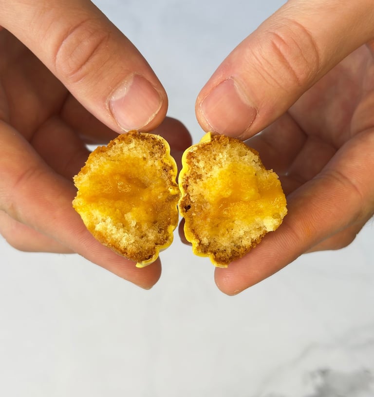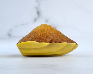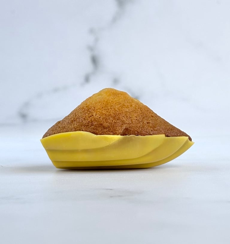 Inspirée du style délicat et généreux de François Perret, cette madeleine revisite le grand classique en un bijou de gourmandise moderne. Sa pâte, fine et délicatement beurrée, offre une texture moelleuse et fondante, avec ce léger rebond caractéristique des madeleines parfaitement maîtrisées.