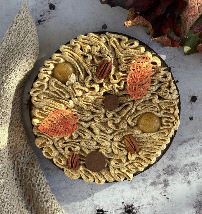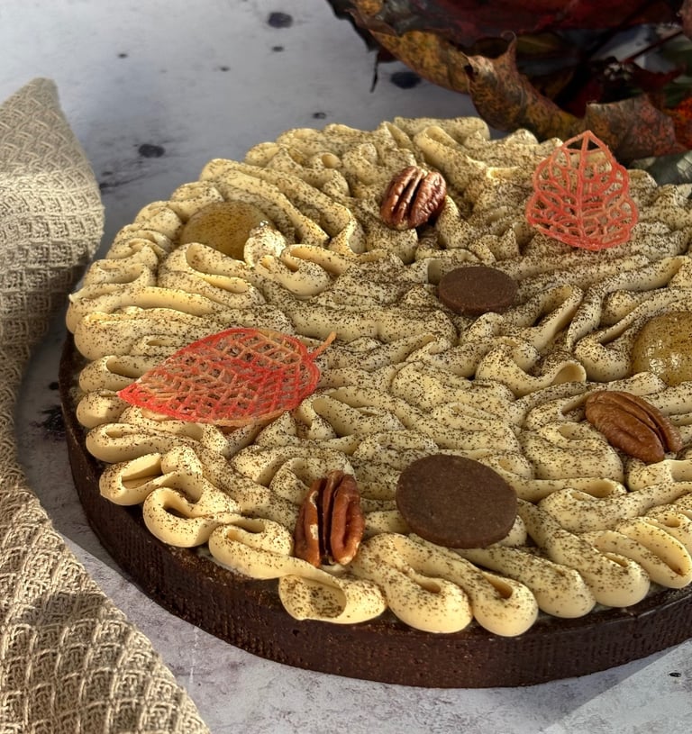 Enfin, la tarte est couronnée d’une ganache montée Dulcey, aérienne, soyeuse et subtilement caramélisée. Sa douceur biscuitée s’accorde parfaitement aux notes chaudes des pécans et à la tendresse des poires.