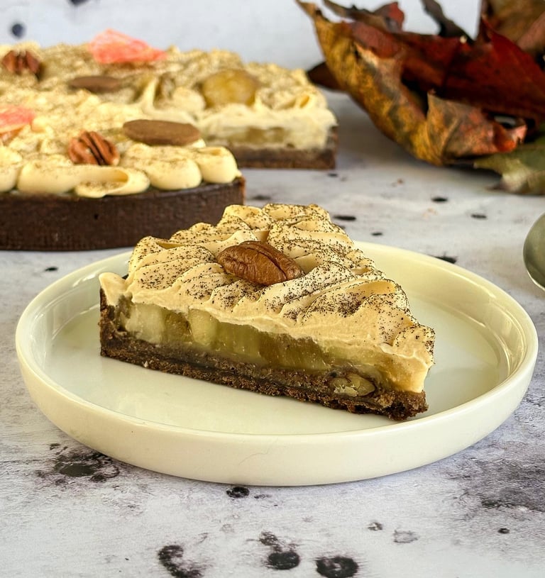 La pâte sucrée pécan, fine et délicatement sablée, apporte une base croustillante relevée par les arômes torréfiés de la noix de pécan. Elle installe d’emblée une chaleur gourmande qui définit la signature de la tarte.