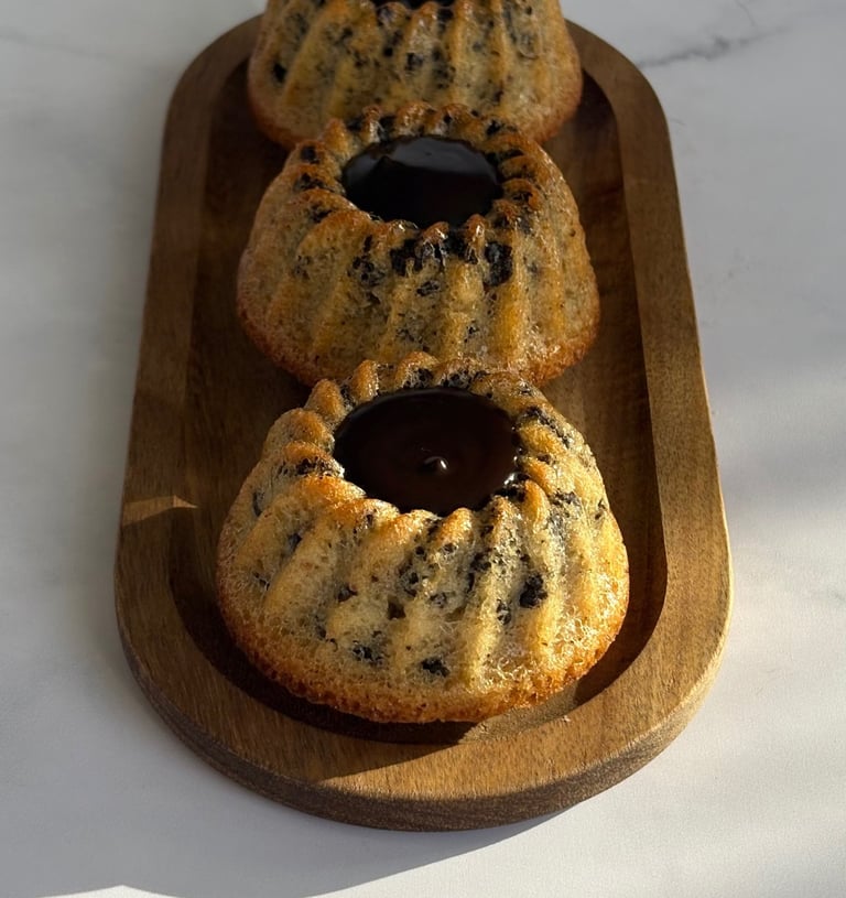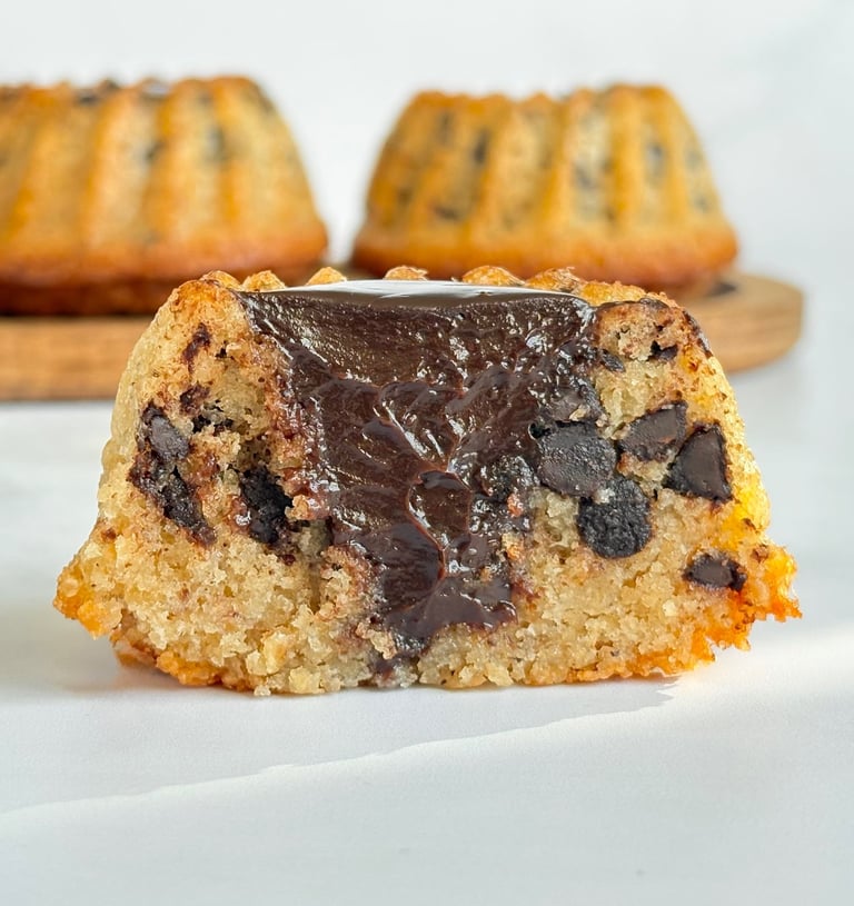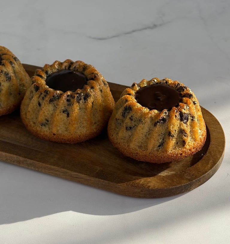 Ces tigrés revisités en mini kougloff mêlent l’élégance d’un moule alsacien et la gourmandise d’un grand classique chocolaté. Leur pâte moelleuse, riche en poudre d’amande, dévoile un fondant ponctué de pépites de chocolat, rappelant le motif tigré qui leur a donné leur nom. La cuisson dans le moule à mini kougloff apporte une silhouette raffinée, légèrement cannelée, qui met en valeur la cavité centrale.